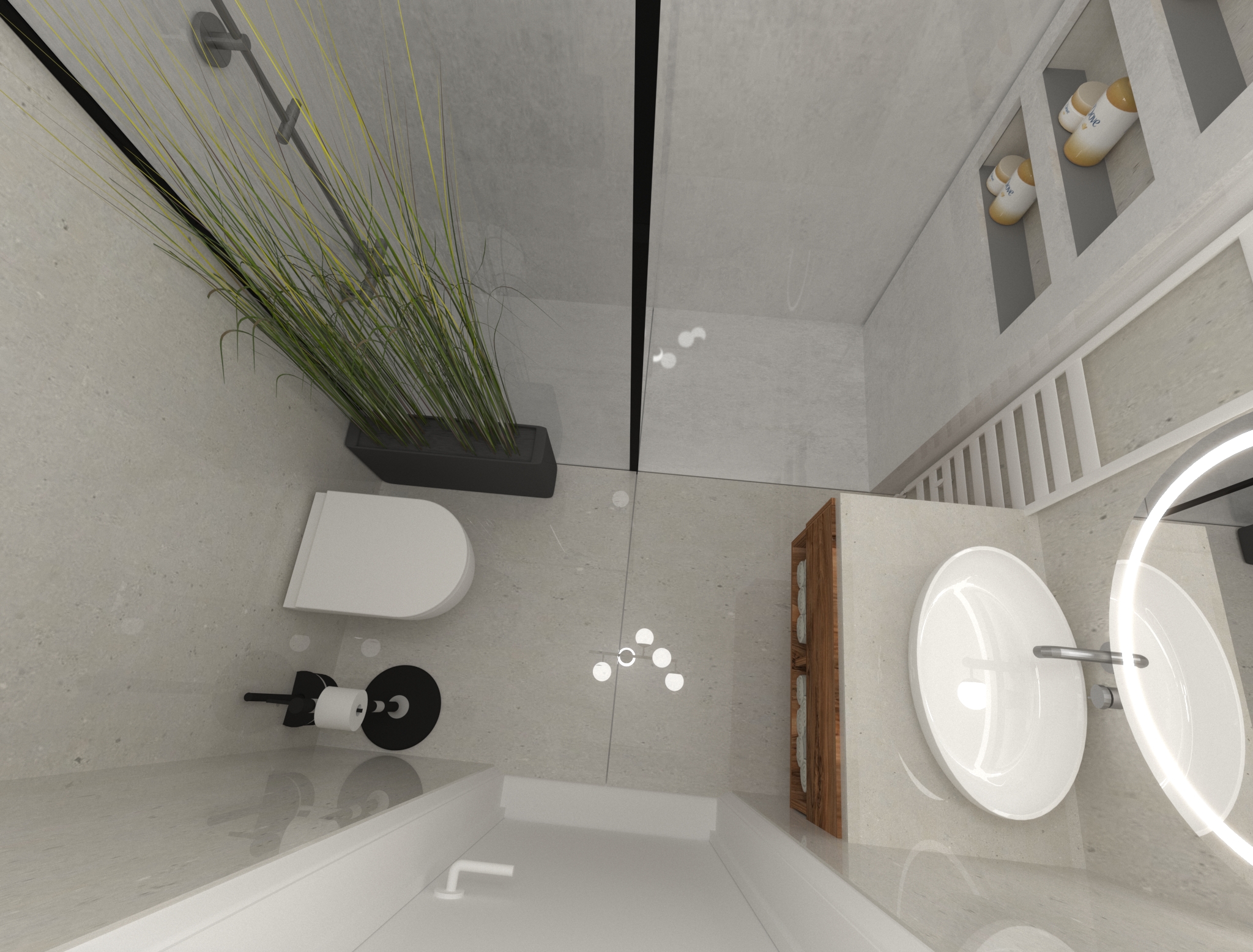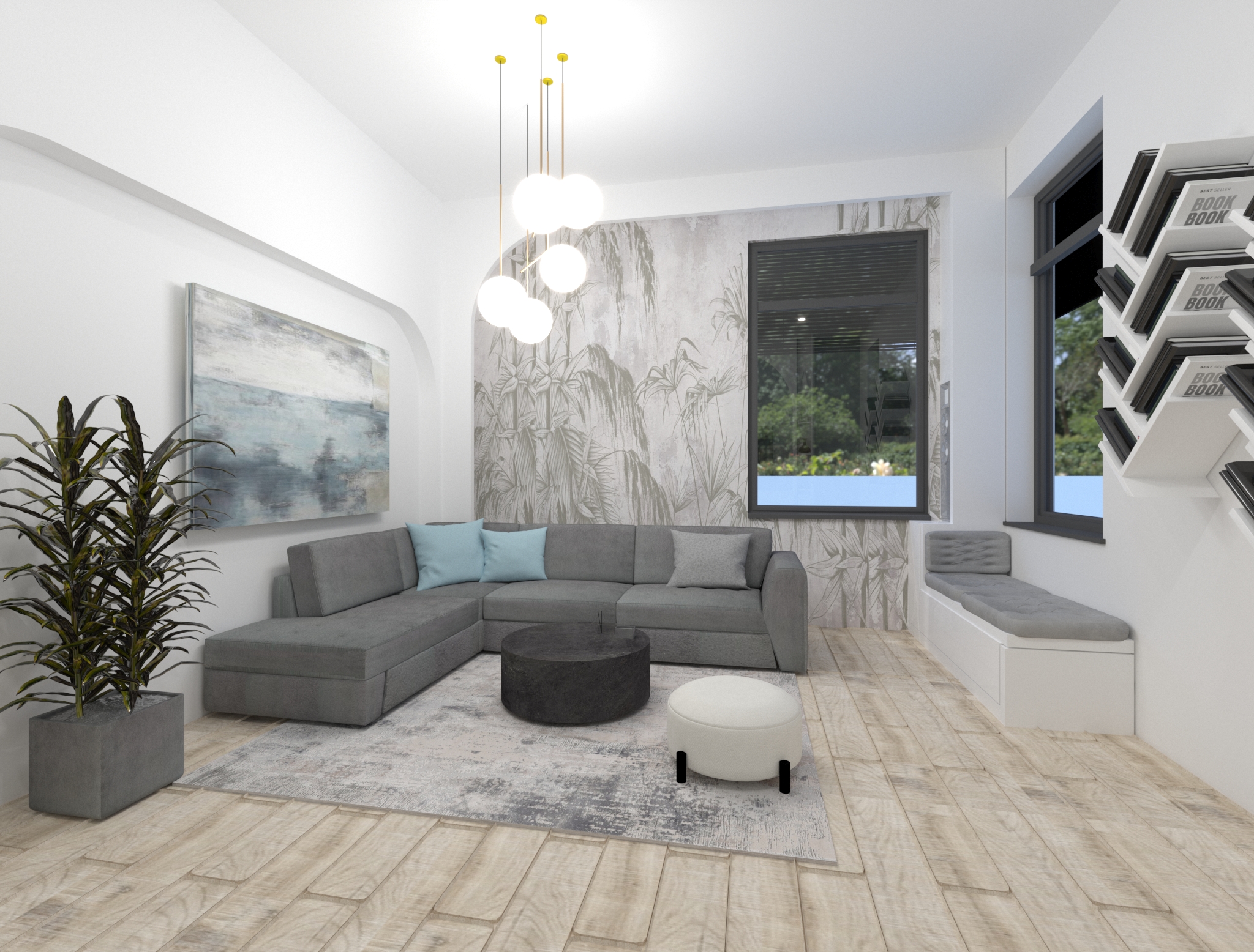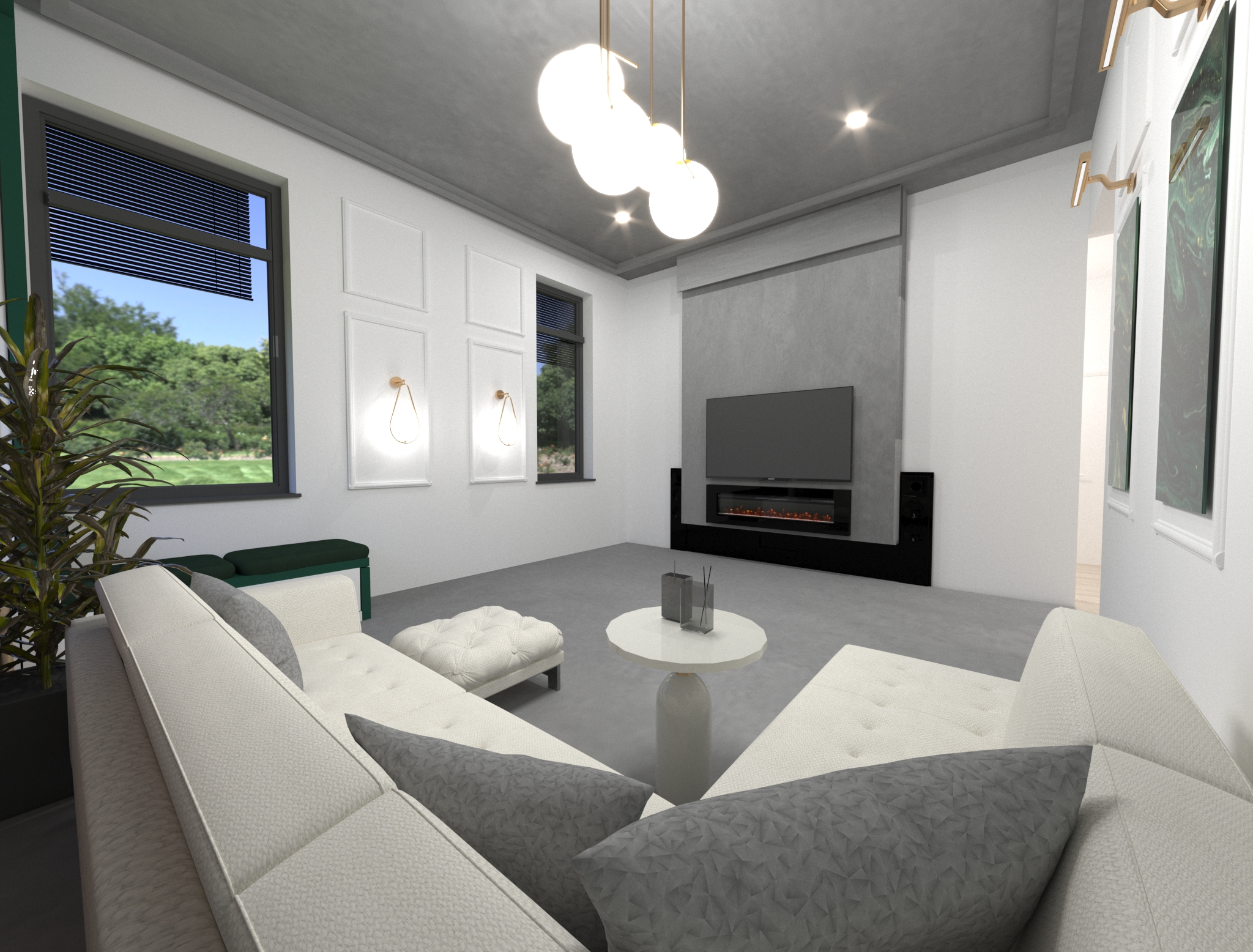 În crearea acestui proiect, am dorit să creez un spațiu modern, dar în același timp primitor și confortabil. Am început prin a alege o paletă de culori neutre, precum alb, gri și bej, pentru a crea un spațiu luminos și spațios. Am adăugat elemente de culoare în decor, precum pernele, covoarele și tablourile, pentru a aduce un strop de personalitate și energie în încăpere.